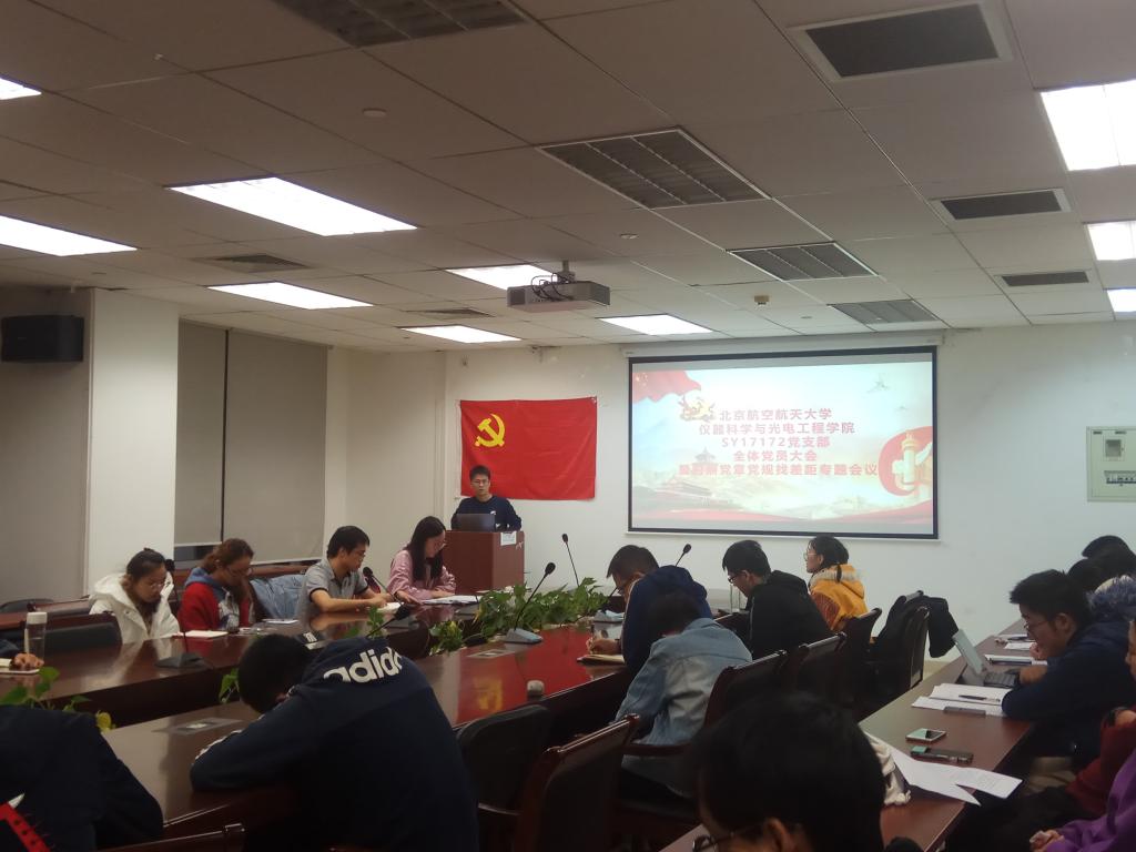 2019年10月26日,SY17172研究生党支部在新主楼B707召开第四次全体党员大会暨对照党章党规找差距专题会议,由熊凯同志主持会议。每位党员都认真学习了《中国共产党章程》、《关于新形势下党内政治生活的若干准则》以及《中国共产党纪律处分条例》材料,会议中,每个到场的党员同志也都分别针对一部分党章党规讲述了自己的学习感想,对比自己和党章党规之间的差距并进行了反思。