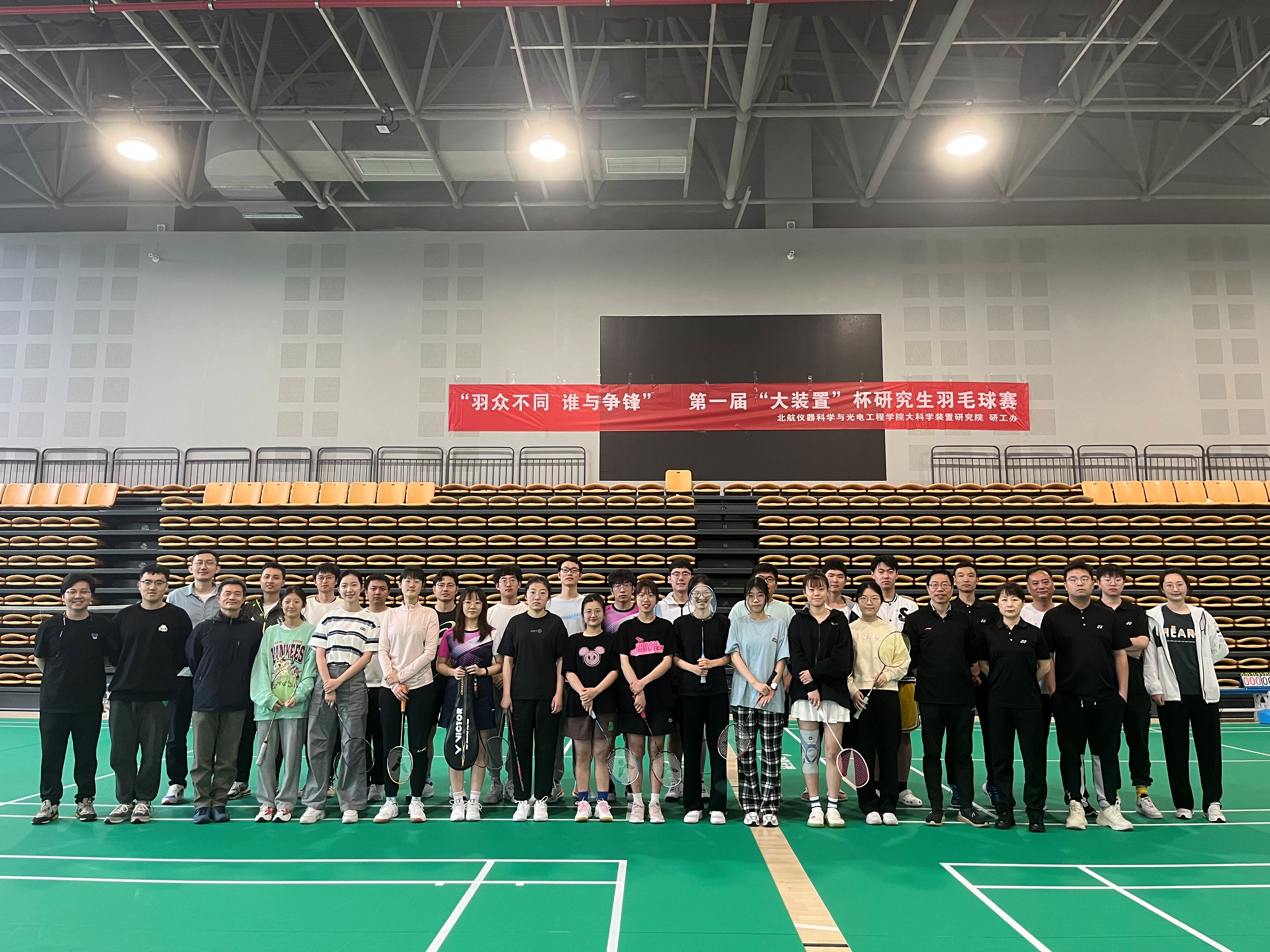为深入贯彻落实习近平总书记关于体育工作及体育事业改革发展的重要论述,迎接杭州亚运会胜利召开,进一步掀起大科学装置研究院学生健身热潮,推动学生增强体质、缓解科研压力,由大科学装置研究院主办,杭州研工办承办的“羽众不同 谁与争锋”第一届“大装置杯”研究生羽毛球赛于2023年5月7日上午9点在杭研院白马湖院区体育馆拉开帷幕。北航仪器科学与光电工程学院党委书记刘刚到场发表动员讲话,为参赛选手鼓气加油;北航仪器科学与光电工程学院专职辅导员卢阳、杭州研工办许金权、杭州研工部辅导员黄炳炳与赵冠华等人到场观赛,21名研究生参加比赛。